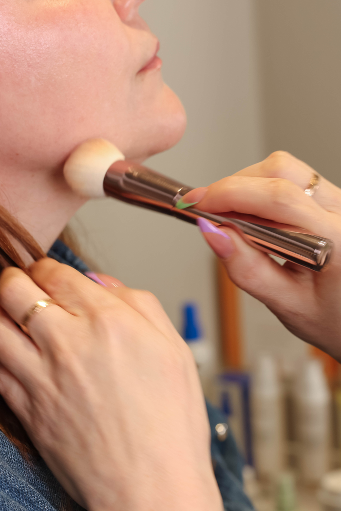 Another secret to making the blush go on smoothly and evenly is to use the right tools. Our favorite tool for cream products is the fingers. Fingers help to warm up the cream products so that you can get the amount of product you need and the heat can also help supplement blending the product into the skin. With that said, sometimes we want to build up the coverage on top of other makeup. In this case, a stippling brush is your go-to! Our favorite stippling brush is the RMS Skin2Skin Blush Brush, $34. It is a vegan and cruelty-free brush that is designed to pick up just the right amount of color. It will glide the product smoothly onto your cheeks without messing up any of your foundation. Make sure to come pick this up in our Seattle Salon for an in person tutorial.